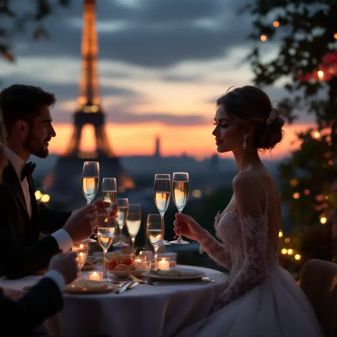 Inspiration parisienne avec une atmosphère glamour et urbaine : décor raffiné, tour Eiffel en filigrane, champagne à volonté et touches de mode haute couture.