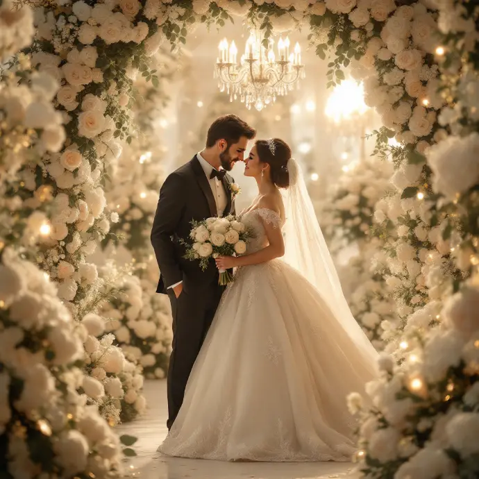 Un mariage élégant, raffiné, avec des tons blancs, ivoire et or, décor floral abondant et une ambiance intemporelle digne des contes de fées.