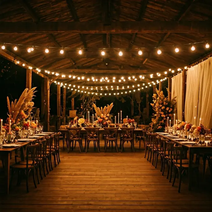Un esprit nature avec des guirlandes lumineuses, des fleurs sauvages, du bois et des matières naturelles pour une célébration authentique et conviviale