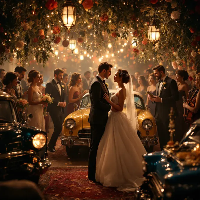 Ambiance années 20, 50 ou 70 avec objets anciens, voitures de collection, robes rétro et musique d’époque pour un mariage unique et original.